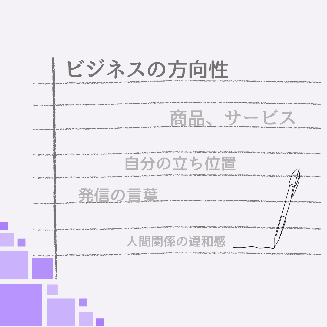 ビジネスの方向性、商品・サービス、自分の立ち位置、発信の言葉、人間関係の違和感。